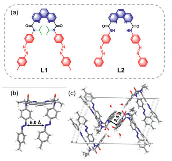 Figure 1.  (a) Chemical structure of the azobenzene-winged phenanthrolines L1 and L2. (b) Crystal structure and (c) unit cell packing diagram of probe L1 (CCDC: 2445719).