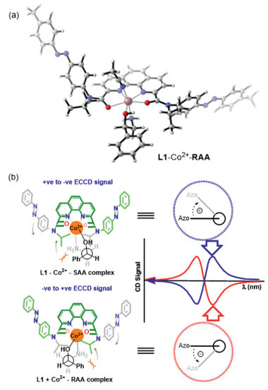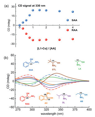 Figure 3  (a) Calculated structure of L1–Co2+–RAA complex. (b) Chiroptical induction mechanism of L1-Co2+ upon coordination with an amino alcohol.