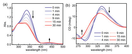 Figure 4.  (a) UV-vis and (b) CD spectra (25 ℃) changes observed for L1-Co2+-SAA complex (0.04 mmol/L), upon irradiation of the solution at 330 nm in dichloromethane at different time intervals.