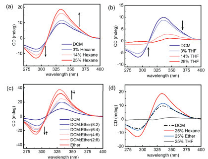 Figure 5  CD spectral (25 ℃) changes observed for L1-Co2+-SAA complex (0.04 mmol/L) in (a) DCM: n-hexane, (b) DCM: THF and (c) DCM: Ether solvent mixtures at different ratios. (d) Comparison of CD spectral signals (25 ℃) of L1-Co2+-SAA complex (0.04 mmol/L) in DCM solutions containing 25% different solvents.