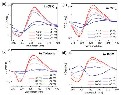 Figure 6.  CD spectral changes of L1-Co2+-SAA complex (0.04 mmol/L) in different solvents: (a) CHCl3, (b) CCl4, (c) toluene and (d) DCM at various temperatures (℃).