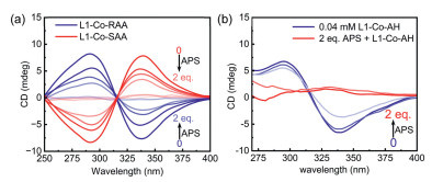 Finally, we investigated the effect of redox on the system. The addition of ammonium persulfate (APS) oxidized the divalent cobalt to trivalent cobalt. As the equivalents of APS increased, the ECCD signals induced by L1-Co2+-RAA/SAA gradually weakened and completely vanished upon the addition of one equivalent of APS (Fig. 7). Upon oxidation of Co2+, the coordination mode of L1 was altered [35]. In addition, the oxidation may lead to a change in coordination geometry from seven-coordinate Co2+ to six-coordinate Co3+ [36]. Thereby disrupting the chiral transfer from the amino alcohol to L1.