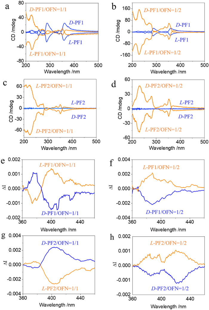 Figure 2  (a–d) CD spectra comparison of self-assembly and co-assembly of different configurations. CPL spectra comparison of assemblies: (e) L/D-PF1/OFN =1/1; (f) L/D-PF1/OFN = 1/2; (g) L/D-PF2/OFN = 1/1; (h) L/D-PF2/OFN = 1/2; λex = 340 nm and 320 nm, respectively. Concentrations of L/D-PF1 and L/D-PF2 were 0.5 mmol/L.