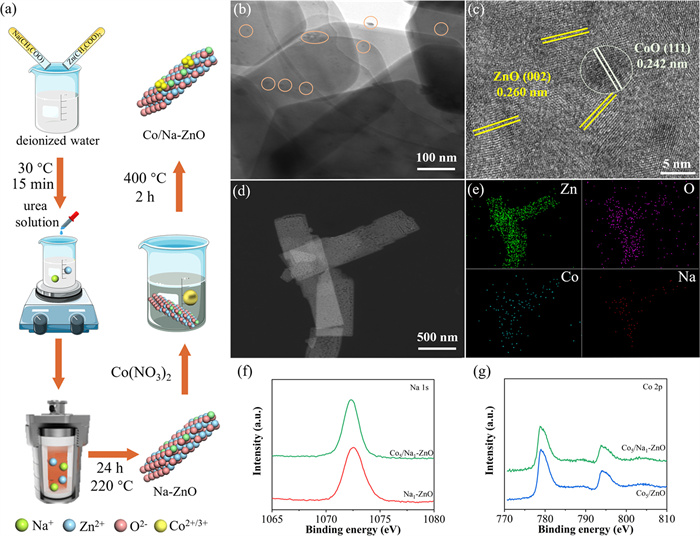 • Figure 1  (a) Schematic diagram of Co5/Na1-ZnO sample preparation process. (b) TEM image, (c) HRTEM image, (d) HAADF-STEM images and (e) The corresponding EDX elemental mapping images of Co5/Na1-ZnO. (f) Na 1s XPS spectra and (g) Co 2p XPS spectra of Na1-ZnO, Co5/ZnO and Co5/Na1-ZnO.