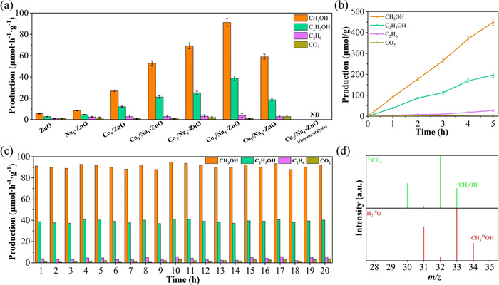 Figure 2  (a) Photocatalytic activity of CH4 conversion over different samples. (b) Time-dependent photocatalytic activity over Co5/Na1-ZnO under light. (c) Production yields in the cyclic tests of Co5/Na1-ZnO. (d) GC–MS spectra of CH318OH and 13CH3OH produced over Co5/Na1-ZnO using an equivalent amount of H218O and 13CH4 as the reactant.