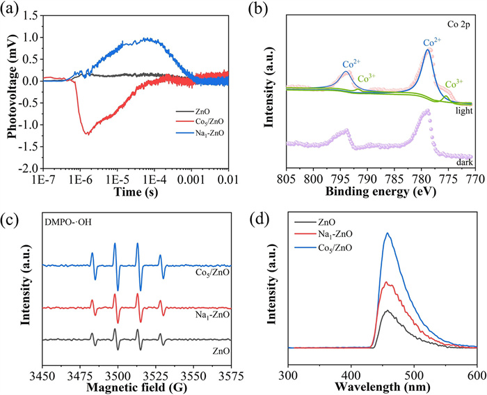 Figure 3.  (a) TR-SPV responses of ZnO, Na1-ZnO and Co5/ZnO. (b) In situ NAP-XPS spectra of Co 2p over Co5/ZnO under light irradiation. (c) EPR spectra and (d) fluorescence spectra related to the amounts of hydroxyl radical formed after irradiation for 1 h of ZnO, Na1-ZnO and Co5/ZnO.