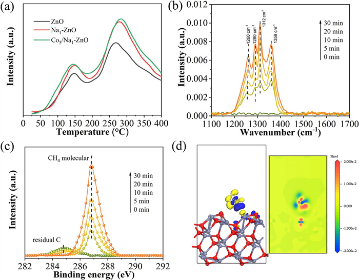 Figure 4  (a) CH4-TPD spectra of Na1-ZnO. (b) In-situ DRIFTS spectra at room temperature with CH4 adsorption in dark for different time Na1-ZnO. (c) C 1s near ambient pressure XPS spectra over Na1-ZnO in Ar purging and upon exposure to 0.45 mbar of CH4 in dark. (d) Different dimensional plots of electron density differences for CH4 adsorbed on Na1-ZnO.