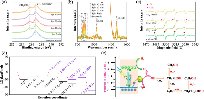 Figure 5.  (a) C 1s near ambient pressure XPS spectra over Co5/Na1-ZnO in Ar purging and upon exposure to 0.45 mbar of CH4 under light irradiation. (b) In-situ DRIFTS spectra at room temperature with CH4 oxidation reaction under light irradiation for different time Co5/Na1-ZnO. (c) In-situ EPR spectra of Co5/Na1-ZnO in water with CH4 dissolved under light irradiation. (d) Calculated potential energy diagrams for CH4 oxidation to CH3OH and C2H5OH on Co5/Na1-ZnO hybrid photocatalyst. (e) Schematic diagram illustrates the pathway for photocatalytic coupling conversion of CH4 to CH3OH and C2H5OH on the designed Co5/Na1-ZnO catalyst.