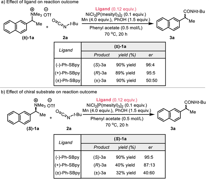 Over the past few years, our team has brought to life an innovative chiral 2,2′-bipyridine ligand named as SBpy, characterized by its [6-5-3] rigid fused-ring structure and adjustable properties [44]. This development has successfully overcome the balancing act between reactivity and selectivity. The SBpy ligand has proven to be highly effective and precise in directing stereochemistry across a range of reactions, such as the asymmetric Ullmann coupling [45], the asymmetric addition to aryl aldehydes [44], and asymmetric carboxylation reactions [46] with CO2 [47]. Drawing inspiration from the electronic similarities between isocyanates and CO2, and capitalizing on the adjustable nature of SBpy, we now introduce the nickel-catalyzed asymmetric reductive amidation of quaternary ammonium salts with alkyl isocyanates. This work paves the way for the production of chiral amides with both good yields and high enantioselectivity (Scheme 1c). It is important to highlight that the inclusion of phenol is pivotal in managing the reactivity of isocyanates throughout the reaction, effectively minimizing unwanted side reactions.