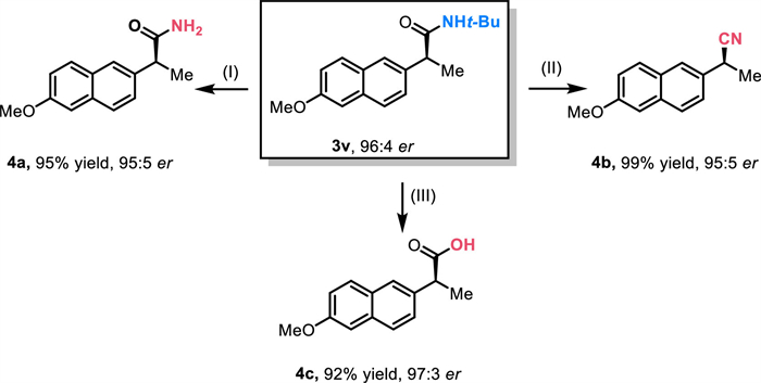 Scheme 3.  Demonstrative transformations of α-chiral amide 3v, (Ⅰ) TfOH, toluene, (Ⅱ) Tf2O, 2-F-Py, DCM, (Ⅲ) LiOH, H2O2, THF/H2O.