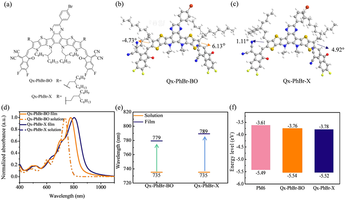 Figure 1.  (a) Molecular structures of the two NFAs. DFT calculation of Qx-PhBr-BO (b) and Qx-PhBr-X (c). (d) Normalized solution and film absorption spectra. (e) Change of the maximum absorption peak positions from the solution to the film state of the two NFAs. (f) Energy levels of PM6, Qx-PhBr-BO, and Qx-PhBr-X.