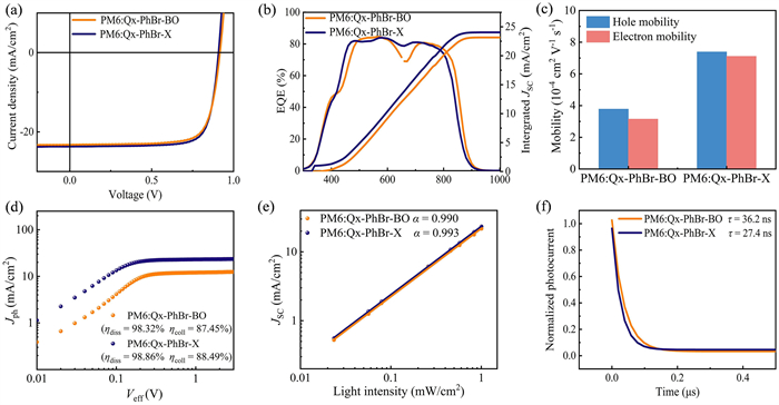 Figure 2  (a) JV curves of the corresponding optimized OSCs. (b) EQE curves and the according integrated current density curves. (c) Histograms of hole and electron mobilities of two NFAs-based devices. (d) Jph versus Veff curves of the OSCs. (e) Light intensity dependence of JSC values of the corresponding optimized devices. (f) TPC measurements of the optimized device.