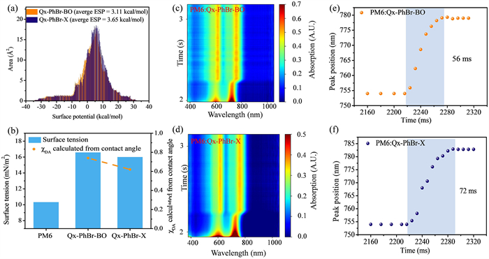 Figure 3  (a) Surface electrostatic potential distribution. (b) Surface energy and interaction parameters. The time evolution of the In-situ UV–vis absorption maps of PM6:Qx-PhBr-BO (c) and PM6:Qx-PhBr-X (d). Peak position evolution of the acceptor during film-formation of PM6:Qx-PhBr-BO (e) and PM6:Qx-PhBr-X (f).