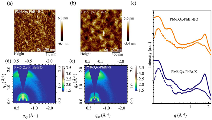 Figure 4  (a, b) AFM images of PM6:Qx-PhBr-BO and PM6:Qx-PhBr-X blend films. (c) In-plane (solid lines) and out-of-plane (dashed lines) cuts. (d, e) Two-dimensional GIWAXS patterns.