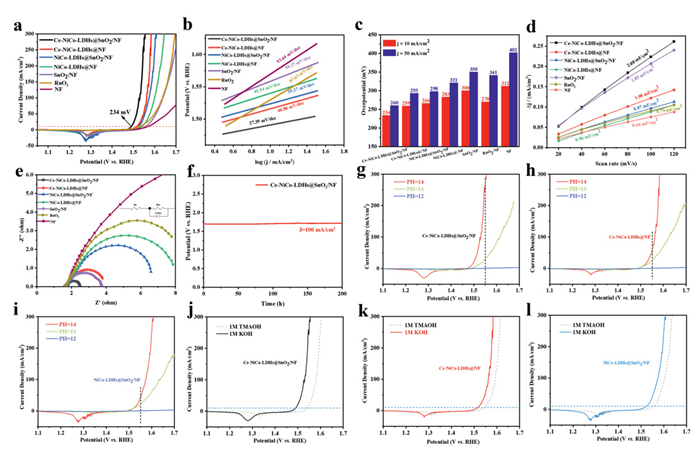 Figure 3.  (a) Reverse scanning LSV curves, (b) Tafel plots, (c) overpotentials corresponding to current densities of 10 and 50 mA/cm2, (d) Cdl values and (e) Nyquist plots of Ce-NiCo-LDHs@SnO2/NF, Ce-NiCo-LDHs@NF, NiCo-LDHs@SnO2/NF, NiCo-LDHs@NF, SnO2/NF, RuO2 and NF. (f) CP test of Ce-NiCo-LDHs@SnO2/NF. (g-i) LSV curves in different PH environment and (j-l) LSV curves in 1 mol/L TMAOH and 1 mol/L KOH.