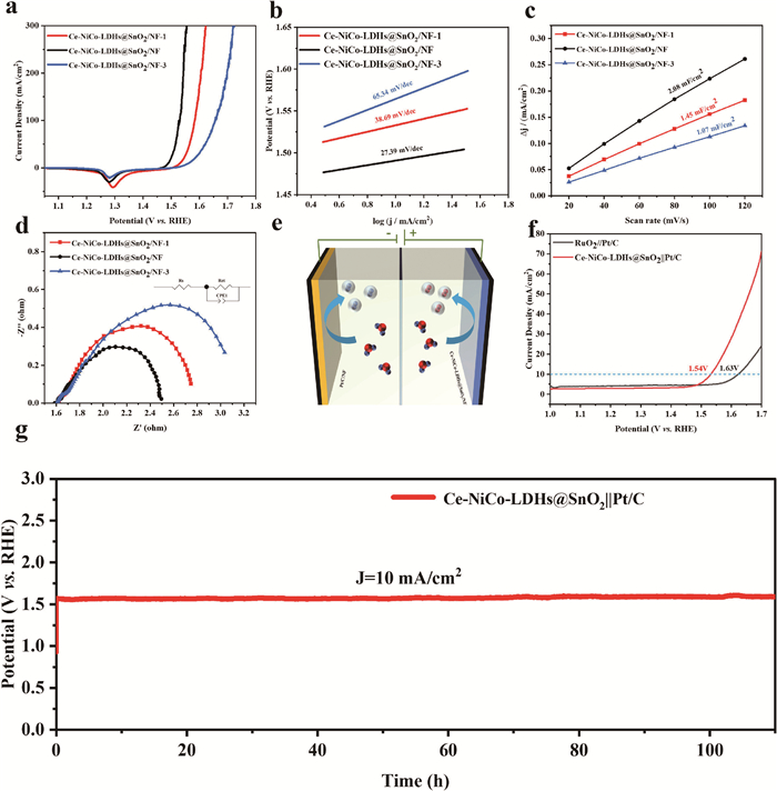 Figure 4  (a) Reverse scanning LSV curves, (b) Tafel plots, (c) CV values and (d) Nyquist plots of Ce-NiCo-LDHs@SnO2/NF-1, Ce-NiCo-LDHs@SnO2/NF and Ce-NiCo-LDHs@SnO2/NF-3. (e) Schematic diagram of electrochemical water decomposition. (f) LSV curves for OWS. (g) CP test for Ce-NiCo-LDHs@SnO2/NF//Pt/C/NF.