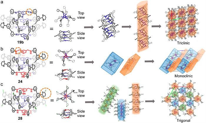 Figure 10.  Controlled self-assembly of (a) 19b into triclinic crystalline phase, (b) 24 into continuous wavelike plank, and (c) 28 into trigonal crystalline phase with well-defined hierarchical structures. The amine panels are labeled in red, and imine panels are labeled in blue. Adapted with permission [66]. Copyright 2020, American Chemical Society.