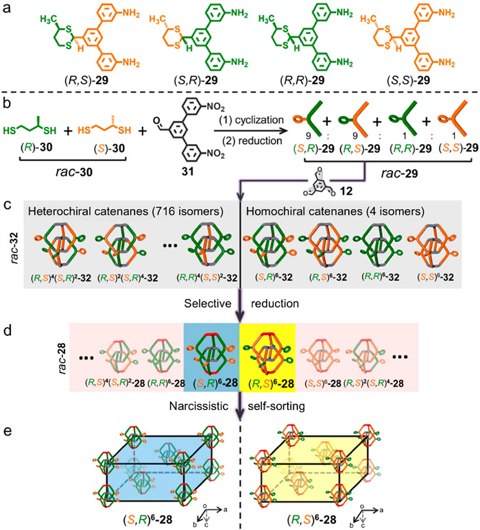 The methyl groups of the dithiane rings in compound 28 are R configurations. Actually, 28 also features other chiral centers, which are the C atoms directly connected to sulfur atoms. The precursors of 29 are also not racemic ((R,S)-29 and (R,R)-29 in Fig. 11a), but the configuration of (R,S)-29 is enantiomeric excess. Nevertheless, only one configuration of interlocked cage was detected in the single-crystal of 28, meaning that a spontaneous chiral resolution occurred during the reaction and crystallization processes. As a consequence, Zhang et al. [67] exquisitely designed a series of experiments to elucidate the spontaneous resolution process. Astonishingly, a pair of homochiral entities were resolved out of 720 possible stereoisomers.