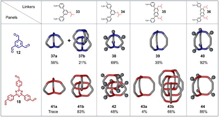 Figure 13  Summary of the product distributions of cage species from imine condensations of different panels and linkers. Adapted with permission [69]. Copyright 2024, American Chemical Society.