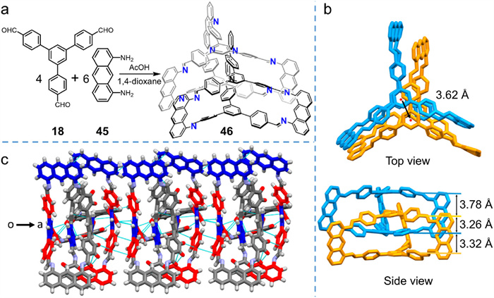 Figure 14  (a) Synthesis of interlocked cage 46 via template-free and one-pot imine condensation reaction. Structure analysis of 46: (b) top view and side view of an interlocked cage and (c) crystal-packing diagram of 46 along the oa axis. Adapted with permission [71]. Copyright 2022 American Chemical Society.