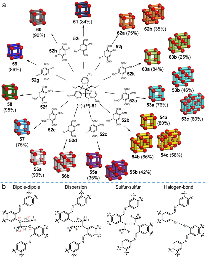 Figure 16  (a) Summary of the product distributions of the imine condensations of (−)-(P)-51 and various dialdehydes (52a−k). (b) Summary of diverse weak interactions leading to the cage-catenane formations. Adapted with permission [73]. Copyright 2023, Springer Nature.