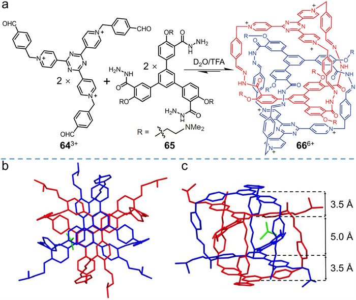 Li et al. [77] prepared an interlocked hydrazone cage via kinetic self-assembly of building blocks in water. In their study, two water-soluble monomers were prepared, including an aldehyde derivative of pyridine salt (643+ in Fig. 17a) and a hydrazine derivative (65 in Fig. 17a). Imine condensation reaction was conducted by mixing two precursors in D2O, facilitating the real-time monitoring of reaction intermediates. Polymers and oligomers were observed at the beginning of the reaction, but the intermediates self-assembled into interlocked species 66 after heating at 70 ℃ for 8 h, as confirmed by 1H NMR, ESI-MS, and HPLC. Single crystals of 66·6Cl were successfully prepared, and SC-XRD analysis (Figs. 17b and c) demonstrated the interlocked structural feature. 66 is triply interlocked and adopts a propeller-like conformation to alleviate steric hindrance. Due to electrostatic repulsion, the tricationic tripyridinium–triazine subunits were found on the outside of the interlocked cage while the two triphenylbenzene panels were encapsulated in the inner cavity of the partner cage. The side view of the crystal structure (Fig. 17c) shows that ππ donor–acceptor interactions (3.5 Å) between benzene and triazine are more favorable than ππ stacking interactions (5 Å) between benzene groups. When the triazine core was replaced with benzene, no interlocked product was observed, further confirming that ππ donor–acceptor interactions are one of the main forces driving interlocking. Hydrophobic effects are also important, since the interlocked dimer disassembled into monomeric cages in strongly polar organic solvents (e.g., DMSO or MeCN). Synergy between the two driving forces ensures that the intermediates self-assemble into interlocked cages under aqueous conditions.