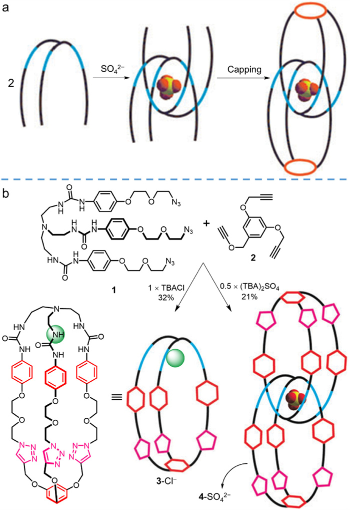 Figure 2  (a) Schematic diagram of the proposed mechanism of the anion templated synthesis process for interlocked structure. (b) Synthesis of monomeric cages 3-Cl and interlocked cage 4-SO42− assisted with different anions by copper(Ⅰ) catalyzed Huisgen 1,3-dipolar cycloaddition reaction. Adapted with permission [27]. Copyright 2009, the Royal Society of Chemistry.