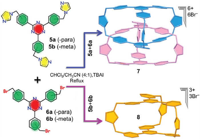 The quest to fabricate interlocked covalent organic cages from irreversible organic reaction encountered diverse challenges, and the next breakthrough would not occur for over a decade. In 2021, Mukherjee et al. [44] found another efficient irreversible reaction that yielded an interlocked imidazolium cage (7 in Fig. 3). 7 was prepared from nucleophilic substitution [45,46] of dilute 5a and 6a (0.235 mmol/L in CHCl3/CH3CN) under refluxing conditions, with tetra-n-butylammonium iodide (TBAI) as a catalyst. 7 was easily isolated with a considerable yield of 26% because of its insolubility in reaction mixture. It was supposed that ππ interactions were the pivotal force driving interlocking, so a mechanism involving a preorganized pathway was proposed. In this mechanism, 5a and 6a pre-organize into a structurally entangled intermediate through ππ stacking, then six imidazolium rings simultaneously cap to form the interlocked structure. To confirm the mechanism, a guest molecule, either 2,4,6-triphenyl-1,3,5-triazine or pyrene, was added to the reaction solution; either prevented the formation of 7. Furthermore, two meta reaction substrates (5b and 6b in Fig. 3) were also tested for interlocked product, but only non-interlocked monomeric cage 8 was detected. Predictably, introducing guest molecules or meta substrates disrupted the ππ stacking between reactants, preventing entangled intermediates from forming.