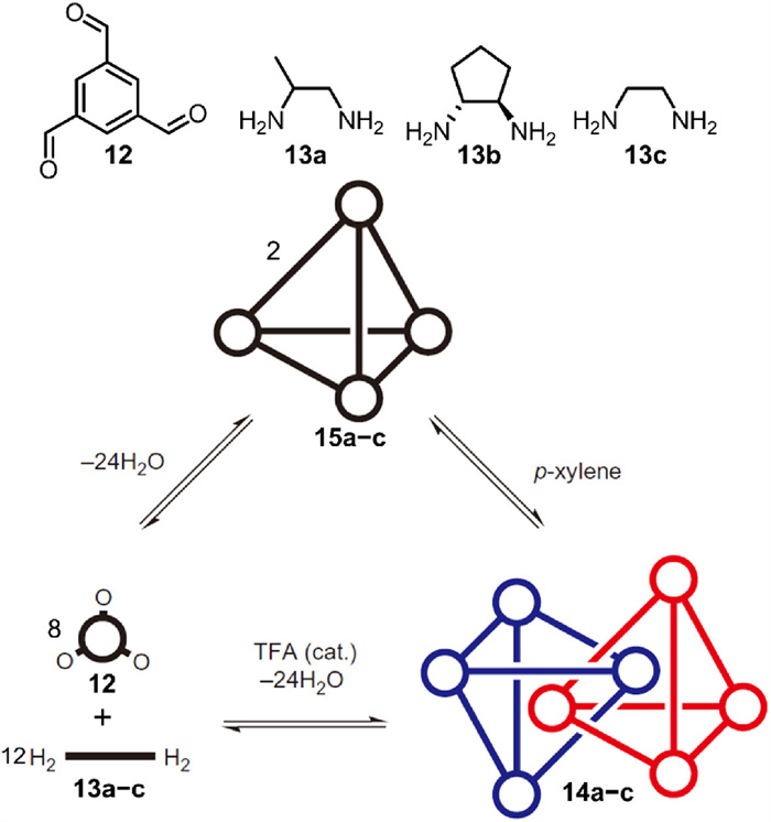 Cooper et al. [63] reported the first series, 14a–c, of interlocked imine cages synthesized by reversible imine condensation with no additional templates (Fig. 5). Starting from the C3-symmetric aldehyde derivative 1,3,5-triformylbenzene (12) and aliphatic amines, imine condensation was conducted in CH3CN at room temperature with TFA as a catalyst. After standing for 7 days, solid products were directly filtered and redissolved in CH2Cl2 to separate insoluble precipitates; evaporation of CH2Cl2 yielded pure products at high yields (40%−60%). Imine condensation tolerated monomers 13a−c, each bearing different substituents; even reactions with mixtures of monomers were successful. The TFA catalyst was believed to play a vital role in producing the interlocked species, since only monomeric cages 15a−c were yielded in its absence. The interlocked cages were further demonstrated to be more thermodynamically favored as the monomeric 15c transformed spontaneously into its interlocked counterpart 14c after 50 days in p-xylene without any catalyst. The acid catalyst principally accelerates the dynamic equilibrium rate of reversible imine formation. This finding demonstrates that the interlocked product can be more thermodynamically stable, in some cases, than its monomeric counterpart.
