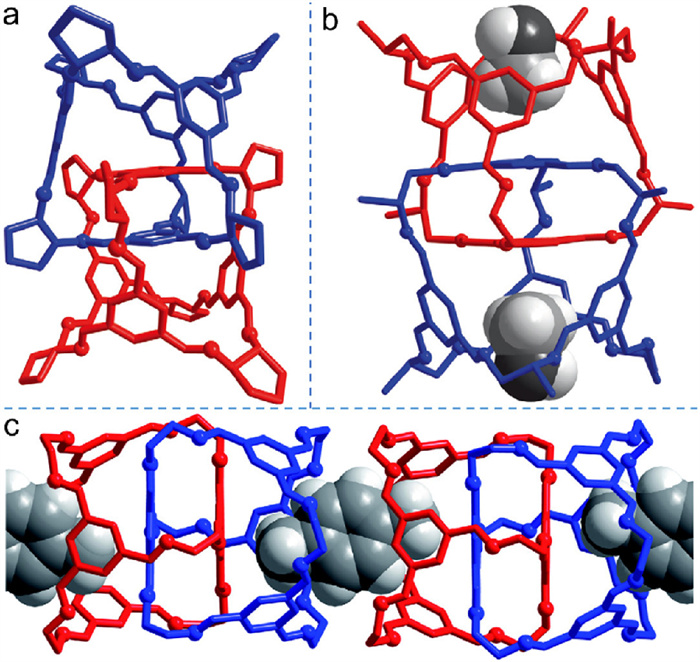 Figure 6  Crystal structures from single crystal data: (a) 14b, (b) 14a accommodating methanol guests, and (c) supramolecular assembly from 14c and p-xylene via host–guest interactions. Adapted with permission [63]. Copyright 2010, Springer Nature.
