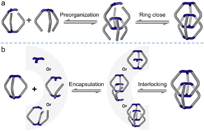 Figure 7  Two general pathways to generate interlocked cages: (a) preorganized interlocking pathway and (b) encapsulated interlocking pathway. Adapted with permission [65]. Copyright 2020, Wiley-VCH.
