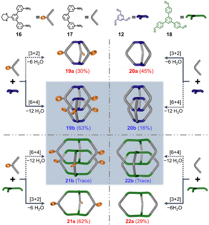 In Zhang’s study, two C2-symmetric aromatic amines (16 and 17 in Fig. 8) were selected as linkers, and two C3-symmetric aromatic trialdehydes (12 and 18 in Fig. 8) were selected as panels. 16 has a sterically hindered dithiane group and 18 bears a flexible skeleton. Cycloimination reactions were carried out using TFA and CHCl3 as a catalyst and a solvent, respectively, and reaction results were indicated by 1H NMR and MALDI-TOF MS. Besides, monomeric or interlocked cages were isolated via flash column chromatography when the yields were considerable. As depicted in Fig. 8, the product distribution of monomeric and interlocked species varies significantly between different amine–trialdehyde combinations. Combining the rigid panel 12 with 16 produced a high yield (63%) of the triply interlocked cage 19b, confirmed by SC-XRD, while combining 12 and 17 produced the interlocked species 20b in much lower yield (16%). Combining the flexible panel 18 with either linker yielded trace amounts of interlocked products, observable only by MALDI-TOF MS. These results imply that a sterically hindered group in the linker and a rigid panel favor the formation of interlocked cages.