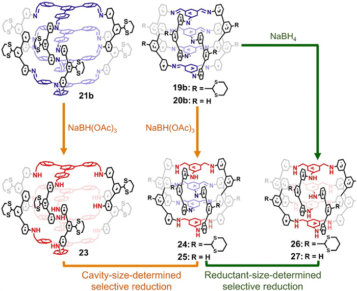 Having ascertained the volume of interlocked cages’ inner cavity by theoretical simulations, catenane with dissymmetric cages (denoted as CDCs) was further prepared via a strategy of selective space-discriminative reduction [65]. As represented in Fig. 9, both the inner cavity volume and the size of reductant play vital roles in determining the final reduction products. For example, CDC 24 was only fabricated from 19b when the size of its reductant (NaBH(OAc)3) did not match the spatial volume of its inner cavity. The bulky NaBH(OAc)3 could not reach 19b’s inner cavity, so it selectively reduced the imine motifs on the outer surface of the interlocked cage. In cases where the reductant was smaller than the inner cavity (e.g., 20b with NaBH4 as a reductant or 21b with NaBH(OAc)3 as reductant), the reductant freely passed into the inner cavity and had access to both exterior and interior imine bonds, leading to non-selective reduction and catenane with symmetric cages (denoted as CSCs).