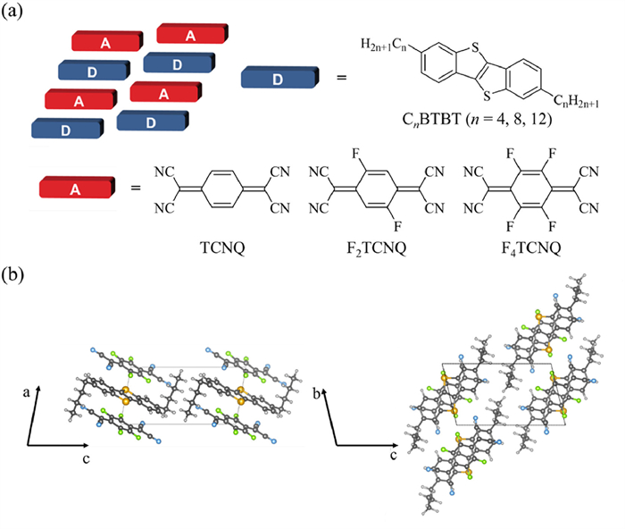 • Figure 1  (a) Schematic diagram of the mix-stacked pattern of CnBTBT–FmTCNQ (denoted as CnFm, the same below) and the involved donors and acceptors in this work. (b) Crystal structure of C4F4 as an example of the CnFm CTC crystal series.
