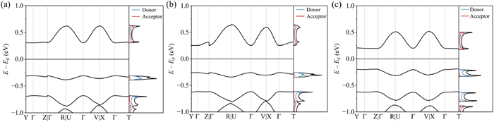 Figure 2  The calculated band structure and density of states of (a) C4F0, (b) C4F2, and (c) C4F4, respectively. The fermi level is set to 0 eV.