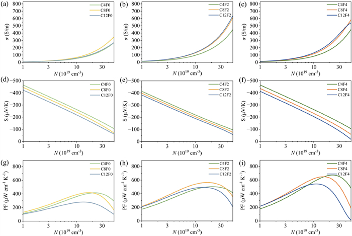 Figure 3  Thermoelectric properties of CnF0 (a, d, g), CnF2 (b, e, h), and CnF4 (c, f, i) as a function of carrier concentration at 300 K. The plots show: (a–c) n-type electrical conductivity, (d–f) n-type Seebeck coefficient, and (g–i) power factor. All values are for the ππ stacking direction of the CTC crystals.