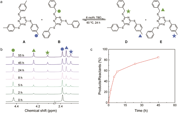 Figure 2  Verification of the dynamic behavior of TCE bonds. (a) Exchange reaction between A and B. (b) Reaction process of 1H NMR spectra at 60 ℃ for 55 h. (c) Extent of the reaction changes over time.