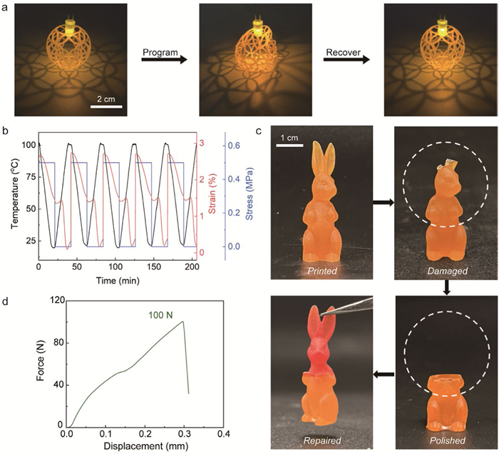 Figure 4  Shape memory and repairing of PTCE1.5. (a) Shape memory photographs of a stereoscopic projection sample. (b) Shape memory curves for 5 cycles of PTCE1.5 obtained by DMA. (c) Photographs of repairing a damaged printed rabbit. (d) Interfacial force of PTCE1.5 via section printing.