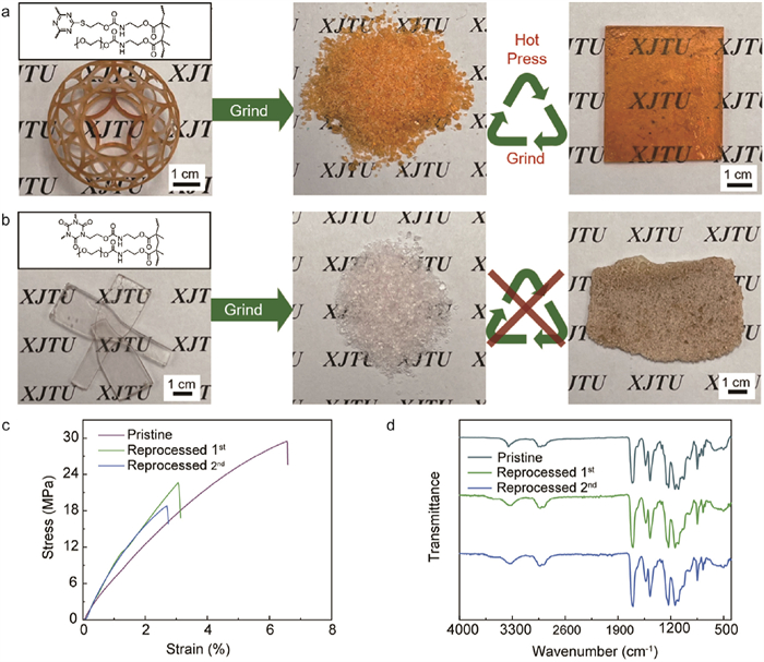Figure 5  Reprocessing recycling and chemical degradation of PTCE1.5. (a) Reprocessing regeneration process of PTCE1.5 from powder to bulk. (b) Reprocessing regeneration process of PTT1.5. (c) Stress-strain curves of the pristine samples and the two generations of reprocessing of PTCE1.5 samples. (d) FTIR spectra of the two generations of reprocessing of PTCE1.5 samples.