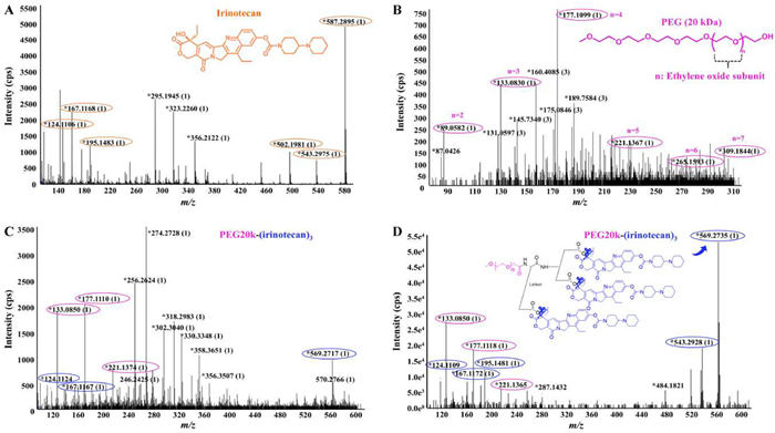 Figure 2  Structures and full scan mass spectra acquired at a fixed DP of 100 V with CE ramping: (A) Irinotecan (CE = 30 eV), (B) PEG20k (CE = 30 eV), (C) PEG20k-(irinotecan)3 (CE = 30 eV), and (D) PEG20k-(irinotecan)3 (CE = 50 eV). Characteristic fragments are labeled for irinotecan (), PEG20k (), and; PEG20k-(irinotecan)3 ().