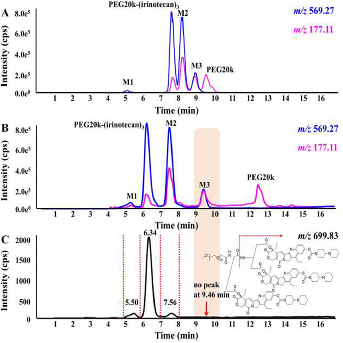 Figure 3  (A) Plasma chromatogram acquired using a linear gradient elution from 30% to 85% solvent B over 8 min. (B) Plasma chromatogram with gradient elution from 70% to 95% solvent B over 13 min. (C) Extracted ion chromatogram (m/z 699.83) showing diagnostic fragments of PEG20k-(irinotecan)x (x = 2, 3).