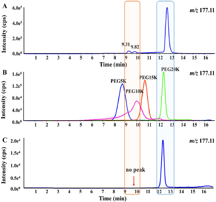 Figure 4.  Chromatograms acquired with a linear gradient (70% → 95% solvent B over 13 min): (A) Extracted ion chromatogram (EIC) of m/z 177.11 from the hydrolyzed plasma sample, (B) PEG standard series (MW 5k-20k Da) EIC profiles, (C) m/z 177.11 EIC of PEG20k-(irinotecan)3 hydrolyzate.