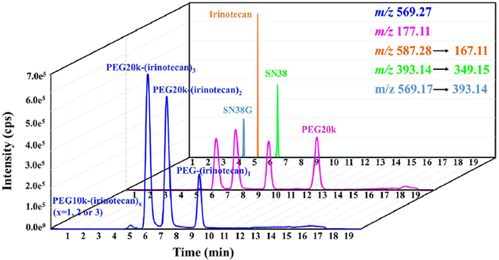 It is important to note that both PEG20k-(irinotecan)2 and PEG20k-(irinotecan)1 consist of three structural isomers due to the asymmetric trivalent linker (Fig. S2 in Supporting information). Under the chromatographic conditions, the isomers of PEG20k-(irinotecan)2 and PEG20k-(irinotecan)1 were grouped respectively. The standards used for their quantification also consist of these three isomers (Fig. S3 in Supporting information).