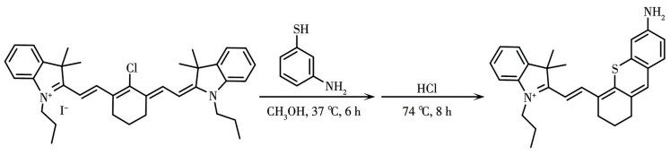 化合物合成中的常用药品、常规溶剂,如二氯甲烷、甲醇、乙醇、石油醚等均为分析纯,购自国内试剂供应商。光谱性质测试中,试剂二甲亚砜(DMSO)为光谱纯级别,购自伊诺凯公司,水为Milli- pore Direct-Q 3UV处理过的超纯水。IR780(2-(2-{2- 氯-3-[(1,3-二氢-3,3-二甲基-1-丙基-2H-吲哚-2-亚基)亚乙基]-1-环己烯-1-基}乙烯基)-3,3-二甲基-1-丙基吲哚鎓碘化物)购于Sigma-Aldrich公司,3-氨基噻吩购于安耐吉公司。磷酸盐缓冲溶液(PBS)为武汉塞维尔生物科技有限公司生产的1×PBS,pH=7.40。紫外可见光谱在UV-3600紫外可见光谱仪上收集。荧光光谱在Spectrofluorometer(Edinburgh FS5)荧光光谱仪上收集。pH用METTLER TOLEDO pH计测试。1H NMR和 13C NMR谱图在Bruker DRX-400核磁仪上收集,以TMS作内标(298 K)。高分辨质谱(HRMS)数据在Triple TOF™5600上采集。MTT细胞增殖及细胞毒性检测试剂盒购于碧云天公司。细胞毒性实验中吸光度在Read Max 1500酶标仪上读取。细胞成像使用Nikon-Ti 2显微镜完成。荧光和紫外可见光谱数据使用Origin 2021软件包处理。细胞中的平均面积强度由NIS Elements软件读出,图片使用软件Image J进行处理。