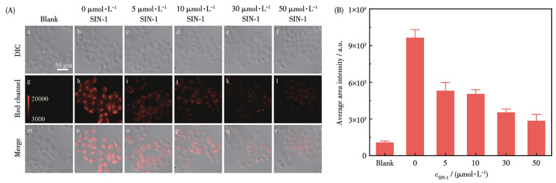 Figure 11 Fluorescence imaging of ONOO- in HeLa cells using the probe: (A) images for the cells incubated with 5 µmol·L-1 probe NSHD for 15 min, then treated with different concentrations of SIN-1 (0-50 µmol·L-1) for 30 min; (B) quantitative graph of average fluorescence intensities in the cells under various incubation conditions