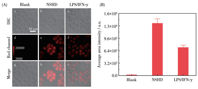 Figure 12 Fluorescence imaging of endogenous ONOO- in HeLa cells using the probe: (A) images of the cells treated by 5 µmol·L-1 NSHD for 15 min, or incubated with LPS (2 µg·mL-1) and IFN-γ (100 ng·mL-1) for 12 h, and then incubated with NSHD (5 µmol·L-1) for 15 min before imaging; (B) corresponding quantitative graph of average fluorescence intensities within the cells