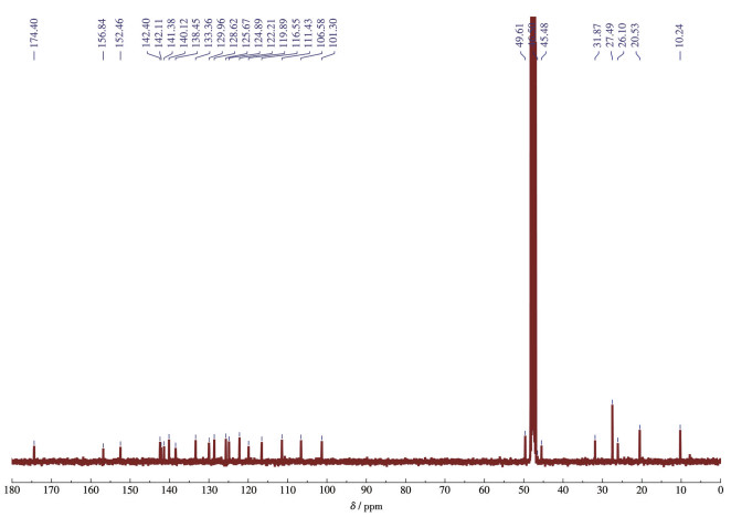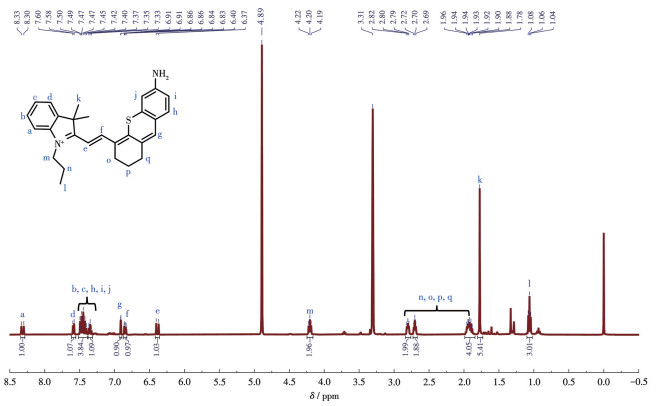 探针NSHD的合成路线如图 1所示。在250 mL三颈烧瓶中,将IR780(1.0 g,1.5 mmol)和3-氨基噻吩(0.37 g,3.0 mmol)溶于30 mL甲醇,在氩气保护下搅拌回流6 h。随后,缓慢加入浓HCl溶液(10 mL),回流反应8 h。反应结束后,冷却至室温,减压蒸馏脱溶剂,将所得粗产物溶于CH2Cl2,有机相用饱和食盐水洗3次,无水MgSO4干燥,抽滤去除干燥剂,减压旋蒸脱溶剂,硅胶柱层析分离提纯,洗脱剂:CH2Cl2/ CH3OH(体积比97∶3),得到蓝绿色粉末(0.5 g,产率60%)。探针NSHD的核磁氢谱和碳谱表征如图 2和3所示。1H NMR(400 MHz,methanol-d4):δ 8.32(d,J= 13.8 Hz,1H),7.59(d,J=7.4 Hz,1H),7.50~7.40(m,4H),7.35(t,J=7.4 Hz,1H),6.91(s,1H),6.85(d,J=8.6 Hz, 1H),6.39(d,J=13.8 Hz,1H),4.20(t,J=7.3 Hz,2H),2.80(t,J=7.3 Hz,2H),2.70(t,J=6.1 Hz,2H),1.96~1.88 (m,4H),1.78(s,6H),1.06(t,J=7.4 Hz,3H)。13C NMR (101 MHz,methanol - d4):δ 174.40,156.84,152.46,142.40, 142.11, 141.38, 140.12, 138.45,133.36,129.96,128.62, 125.67, 124.89, 122.21, 119.89,116.55,111.43,106.58, 101.30, 49.61, 45.48, 31.87, 27.49,26.10,20.53,10.24,7.81。HRMS(m/z,正离子模式):实验值427.221 7,拟合值427.220 2([C28H31N2S]+)。