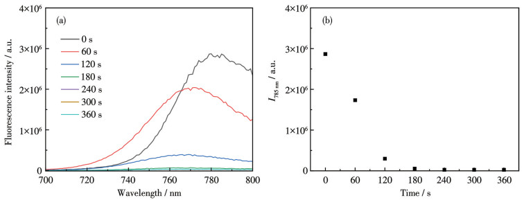Figure 5 (a) Changes in fluorescence spectra over time after adding 40 µmol·L-1 ONOO- to PBS (10 mmol·L-1, pH=7.4, φDMSO=30%) containing 20 µmol·L-1 NSHD; (b) Time-dependent fluorescence intensities of the probe at 785 nm after the addition of 40 µmol·L-1 ONOO-