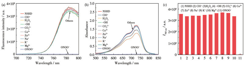 Figure 6 (a) Fluorescence emission spectra and (b) UV-Vis absorption spectra of PBS (10 mmol·L-1, pH=7.4, φDMSO=30%) containing 20 µmol·L-1 NSHD in the presence of ONOO- and other common species of living systems; (c) Fluorescence intensity of NSHD at 785 nm in the presence of ONOO- and other common species of living systems