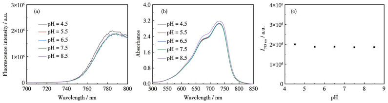 Figure 7 (a) Fluorescence emission and (b) UV-Vis absorption spectra of PBS (10 mmol·L-1, φDMSO=30%) containing 20 µmol·L-1 NSHD with various pH values; (c) Fluorescence intensity changes of the probe at 785 nm at various pH values